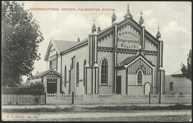 | Keywords: outdoor photo border Shows a photograph of the Emmanuel Congregational Church, a wooden building behind a picket fence. Inscriptions: Inscribed - Verso - centre: [Letter to Mr W F Eggers].. Quantity: 1 colour photo-mechanical print(s) on postcard.. Physical Description: Photolithograph, black and white with red lettering, 89 x 139 mm. [Postcard]. Congregational Church, Palmerston North. New Zealand Post-card (carte postale) F T Series no. 882 [1906].. [Postcard album of cards collected by Joye Eggers / Taylor. 1905-1970s].. Ref: Eph-B-POSTCARD-Vol-6-094-1. Alexander Turnbull Library, Wellington, New Zealand. natlib.govt.nz/records/23236617 Shows a photograph of the Emmanuel Congregational Church, a wooden building behind a picket fence. Inscriptions: Inscribed - Verso - centre: [Letter to Mr W F Eggers].. Quantity: 1 colour photo-mechanical print(s) on postcard.. Physical Description: Photolithograph, black and white with red lettering, 89 x 139 mm. [Postcard]. Congregational Church, Palmerston North. New Zealand Post-card (carte postale) F T Series no. 882 [1906].. [Postcard album of cards collected by Joye Eggers / Taylor. 1905-1970s].. Ref: Eph-B-POSTCARD-Vol-6-094-1. Alexander Turnbull Library, Wellington, New Zealand. natlib.govt.nz/records/23236617 |