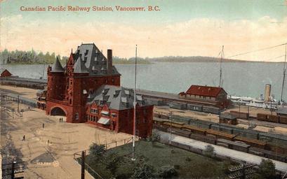 | Keywords: outdoor "Canadian Pacific Railway Station, Vancouver, B.C." Post Card. The Valentine & Sons' Publishing Co., Ltd. Montreal and Toronto. Printed in Great Britain. The second CPR Station (1899-1914), foot of Granville Street, Vancouver, BC. Located at the northern foot of Granville Street, the first little wooden station and platform, built just in time for the arrival of the first train in May 1887, was demolished in 1898 to make way for this much grander structure. Built in 1899 in the CPR's famous "railroad baronial chateau" style, with two bulging turrets and a grand arch connecting Granville Street with the platform and trains. It was demolished after the completion of the third CPR station (1914), one block to the east (at 601 W. Cordova St.). It has been suggested that due to poor-quality bricks used in its construction the building had to be torn down. "Canadian Pacific Railway Station, Vancouver, B.C." Post Card. The Valentine & Sons' Publishing Co., Ltd. Montreal and Toronto. Printed in Great Britain. The second CPR Station (1899-1914), foot of Granville Street, Vancouver, BC. Located at the northern foot of Granville Street, the first little wooden station and platform, built just in time for the arrival of the first train in May 1887, was demolished in 1898 to make way for this much grander structure. Built in 1899 in the CPR's famous "railroad baronial chateau" style, with two bulging turrets and a grand arch connecting Granville Street with the platform and trains. It was demolished after the completion of the third CPR station (1914), one block to the east (at 601 W. Cordova St.). It has been suggested that due to poor-quality bricks used in its construction the building had to be torn down. |