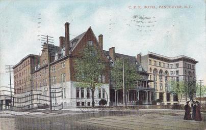 | Keywords: outdoor architecture building "C. P. R. Hotel, Vancouver, B. C." Published by W. G. MacFarlane, Toronto and Buffalo. Printed in Germany. View of the original CPR Hotel Vancouver, with additions, on the SW corner of West Georgia and Granville Streets in Vancouver, BC, circa-1908. The corner, "simplified chateau style" structure was the original hotel, built 1886-87 (Thomas Sorby, architect). The addition to the south, along Granville Street (left), was built in 1893-94. The western addition, in an Italian Renaissance palazzo style (right), was built 1901-05 (Francis M. Rattenbury, architect). Most of the buildings were replaced by the second CPR Hotel Vancouver structure (built 1913-16). Only Rattenbury's west-side corner structure (at Georgia and Howe Sts.) was incorporated into the new project. "C. P. R. Hotel, Vancouver, B. C." Published by W. G. MacFarlane, Toronto and Buffalo. Printed in Germany. View of the original CPR Hotel Vancouver, with additions, on the SW corner of West Georgia and Granville Streets in Vancouver, BC, circa-1908. The corner, "simplified chateau style" structure was the original hotel, built 1886-87 (Thomas Sorby, architect). The addition to the south, along Granville Street (left), was built in 1893-94. The western addition, in an Italian Renaissance palazzo style (right), was built 1901-05 (Francis M. Rattenbury, architect). Most of the buildings were replaced by the second CPR Hotel Vancouver structure (built 1913-16). Only Rattenbury's west-side corner structure (at Georgia and Howe Sts.) was incorporated into the new project. |