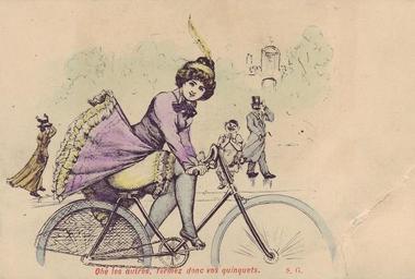 Keywords: Postcard cycling girl.jpg en Postcard with a girl on a bicylce France c 1900s http //ilikethethingsilike blogspot com/2010_08_01_archive html circa 1900 s žS G PD-old Cycling in art Upskirt in art