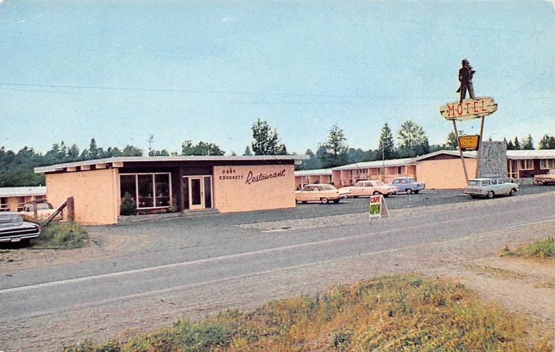 | Keywords: outdoor vehicle railroad "Davy Crockett Motel Abbotsford, B.C. Just off the cloverleaf at Highways 1 and 11, Abbotsford. The davy Crockett Motel has for your convenience a modern air-conditioned dining-room and cafe. Also a bright swimming pool in the centre of a lovely garden." Post Card. AP-1. Made in Canada, Agency Press Ltd. Davy Crockett Motel, 1881 Sumas Way, Abbotsford, BC. "Davy Crockett Motel Abbotsford, B.C. Just off the cloverleaf at Highways 1 and 11, Abbotsford. The davy Crockett Motel has for your convenience a modern air-conditioned dining-room and cafe. Also a bright swimming pool in the centre of a lovely garden." Post Card. AP-1. Made in Canada, Agency Press Ltd. Davy Crockett Motel, 1881 Sumas Way, Abbotsford, BC. |