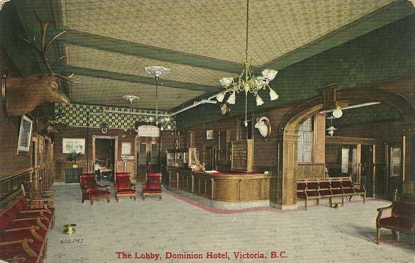 | Keywords: "The Lobby, Dominion Hotel, Victoria, B.C." Souvenir Post Card. Printed in Great Britain.  "The Lobby, Dominion Hotel, Victoria, B.C. Seldom can a City Hotel boast of such a large and well-appointed Lobby as "The Dominion." The floor is laid with mosaic tiling. The walls are marble and oak and the seats richly upholstered. The Writing-Room adjoins the Lobby."  Dominion Hotel, 759 Yates Street, Victoria, BC. Built 1890, additions 1900, 1913. Extant as the Dalton Hotel & Suites ( www.daltonhotel.ca/index.php ). "The Lobby, Dominion Hotel, Victoria, B.C." Souvenir Post Card. Printed in Great Britain.  "The Lobby, Dominion Hotel, Victoria, B.C. Seldom can a City Hotel boast of such a large and well-appointed Lobby as "The Dominion." The floor is laid with mosaic tiling. The walls are marble and oak and the seats richly upholstered. The Writing-Room adjoins the Lobby."  Dominion Hotel, 759 Yates Street, Victoria, BC. Built 1890, additions 1900, 1913. Extant as the Dalton Hotel & Suites ( www.daltonhotel.ca/index.php ).  |