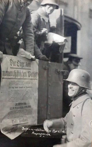 Keywords: 20th century 20thcentury soviet union sovietunion boris souvarine borissouvarine russia postcard berlin soldiers revolution 1919 spartacist uprising spartacistuprising communist party communistparty kapp putsch kappputsch germany working class workingclass Boris Souvarine Papers - Soviet Russia Photos graduateinstitute.ch/home/research/library/archives/boris... Notes: This postcard shows a soldier smiling, in front of a poster stating "Die Lüge vom monarchistischen Putsch" ("The lie of the monarchist putsch"). The manuscript note was added on the original postcard. This postcard refers to the Kapp Putsch, which took place in March 1920 and was a monarchist coup intended to overthrow the Weimar Republic. The putsch failed after a general strike, which received massive support among the working class. Description: 1 postcard. Black and white ; 9 x 14 cm. Boris Souvarine Papers - Soviet Russia Photos graduateinstitute.ch/home/research/library/archives/boris... Notes: This postcard shows a soldier smiling, in front of a poster stating "Die Lüge vom monarchistischen Putsch" ("The lie of the monarchist putsch"). The manuscript note was added on the original postcard. This postcard refers to the Kapp Putsch, which took place in March 1920 and was a monarchist coup intended to overthrow the Weimar Republic. The putsch failed after a general strike, which received massive support among the working class. Description: 1 postcard. Black and white ; 9 x 14 cm. |