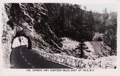 | Keywords: outdoor photo border "The Cariboo Hwy. Eighteen Miles East of Yale, B. C." Made in Canada by the Gowen, Sutton Co. Ltd., Vancouver, B.C. Two tunnels on the old Fraser Canyon Highway (a.k.a. Cariboo Highway) at Tunnel Bluff. Original photo retouched to replace the gravel roadway with a modern, paved one. "The Cariboo Hwy. Eighteen Miles East of Yale, B. C." Made in Canada by the Gowen, Sutton Co. Ltd., Vancouver, B.C. Two tunnels on the old Fraser Canyon Highway (a.k.a. Cariboo Highway) at Tunnel Bluff. Original photo retouched to replace the gravel roadway with a modern, paved one. |