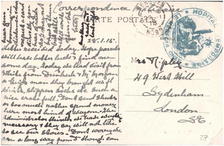 Keywords: postcard bergues france public domain publicdomain ww1 nurse ripley nurseripley document writing text drawing sketch Sent by a nurse, Margaret Ripley, to her mother back in England. As far as I can tell (corrections and additions welcome) this reads: "28.1.15 Letter received today. Hope parcels will have better luck & find me some day. Today we had visit from White[?] from Dunkirk & Mr Morgan a Guy's man they bought us [???] shirts, slippers socks etc such a nice crate full. Don't send [???] or too much rather spend money here most kind of everyone. The administrator thinks we have everything neccessary & they say will not like to see our [stoves/stores???]. Don't worry we are a long way from [D? Dunkirk???] though can hear guns booming in distance & don't expect a card directly you hear of raids as I may not know of them but still will write often. Love Mar" Then in a slightly darker ink, suggesting it was written later "another raid[?] out[?] last night" This is the first sign we have seen in the cards of the reality of war and her presence close to the front. For more details of the story behind this album see www.flickr.com/photos/whatsthatpicture/sets/7215762769463... Sent by a nurse, Margaret Ripley, to her mother back in England. As far as I can tell (corrections and additions welcome) this reads: "28.1.15 Letter received today. Hope parcels will have better luck & find me some day. Today we had visit from White[?] from Dunkirk & Mr Morgan a Guy's man they bought us [???] shirts, slippers socks etc such a nice crate full. Don't send [???] or too much rather spend money here most kind of everyone. The administrator thinks we have everything neccessary & they say will not like to see our [stoves/stores???]. Don't worry we are a long way from [D? Dunkirk???] though can hear guns booming in distance & don't expect a card directly you hear of raids as I may not know of them but still will write often. Love Mar" Then in a slightly darker ink, suggesting it was written later "another raid[?] out[?] last night" This is the first sign we have seen in the cards of the reality of war and her presence close to the front. For more details of the story behind this album see www.flickr.com/photos/whatsthatpicture/sets/7215762769463... |