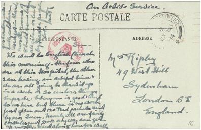 | Keywords: postcard le havre lehavre sainte addresse sainteaddresse nurse hospital ripley public domain publicdomain ww1 nurse ripley nurseripley text writing document drawing sketch I am uploading these postcards chronologically. I believe this was sent not more than a few days after Margaret, a nurse, had arrived in France. The front depicts Sainte Adresse, France, which must have been where she was based as she mentions walking along here. It is less than a kilometer north of the center of Le Havre. From what I can read (corrections welcome), she writes: "Sun[day]. We went to English Church this morning - the four who are at this hospital , the other 2 are having an awful time & we are all going to throw[?] it up in a week or so unless things improve. Everyone is good & kind to us here but there is no work just given out 120 Red packets sent by our [???]. Nearly all are fairly convalescent now anyway can get up mostly. Went along here for walk yesterday awe[?]-fully cold here except in wards mostly rooms of 8 beds some larger all given or lent by Havre[?] people. Love Mar" I am uploading these postcards chronologically. I believe this was sent not more than a few days after Margaret, a nurse, had arrived in France. The front depicts Sainte Adresse, France, which must have been where she was based as she mentions walking along here. It is less than a kilometer north of the center of Le Havre. From what I can read (corrections welcome), she writes: "Sun[day]. We went to English Church this morning - the four who are at this hospital , the other 2 are having an awful time & we are all going to throw[?] it up in a week or so unless things improve. Everyone is good & kind to us here but there is no work just given out 120 Red packets sent by our [???]. Nearly all are fairly convalescent now anyway can get up mostly. Went along here for walk yesterday awe[?]-fully cold here except in wards mostly rooms of 8 beds some larger all given or lent by Havre[?] people. Love Mar" |