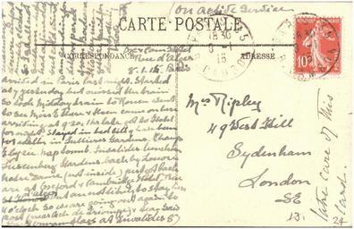 | Keywords: postcard ww1 france public domain publicdomain nurse ripley nurseripley document writing text Sent by a nurse, Margaret Ripley, to her mother back in England. As far as I can tell (corrections and additions welcome) this reads: "Arrived in Paris last night. Started at 7 yesterday but missed the train so took midday train to Rouen went to see Miss E there & then came on here arriving at 9.30. 1 hr late got to hotel for night. Stayed in bed til 9 have been for walk in Tuileries Gardens. Champs Elysee. Nap[oleon's] Tomb. Invalides luncheon Luxemburg Gardens back by Louvre Notre Dame (not inside) just got back am at Oxford & Cambridge Hotel. Rue d'Algiers[?] but are not likely to stay here. 4 o'clock so we are going out again to post (near Arc de Triomphe) & tea. Saw the German flags at Invalides [??] Luxemburg & Louvre unfortunately closed so I shall not see them. Lucky[?] had a fine day but cold wind. Am sending for letters parcel from Bordeaux. It is very nice getting paid for doing nothing. Love Mar" Beside the address, I think in another hand, is written "take care of this card". Don't worry, I intend to! For more details of the story behind this album see www.flickr.com/photos/whatsthatpicture/sets/7215762769463... Sent by a nurse, Margaret Ripley, to her mother back in England. As far as I can tell (corrections and additions welcome) this reads: "Arrived in Paris last night. Started at 7 yesterday but missed the train so took midday train to Rouen went to see Miss E there & then came on here arriving at 9.30. 1 hr late got to hotel for night. Stayed in bed til 9 have been for walk in Tuileries Gardens. Champs Elysee. Nap[oleon's] Tomb. Invalides luncheon Luxemburg Gardens back by Louvre Notre Dame (not inside) just got back am at Oxford & Cambridge Hotel. Rue d'Algiers[?] but are not likely to stay here. 4 o'clock so we are going out again to post (near Arc de Triomphe) & tea. Saw the German flags at Invalides [??] Luxemburg & Louvre unfortunately closed so I shall not see them. Lucky[?] had a fine day but cold wind. Am sending for letters parcel from Bordeaux. It is very nice getting paid for doing nothing. Love Mar" Beside the address, I think in another hand, is written "take care of this card". Don't worry, I intend to! For more details of the story behind this album see www.flickr.com/photos/whatsthatpicture/sets/7215762769463... |