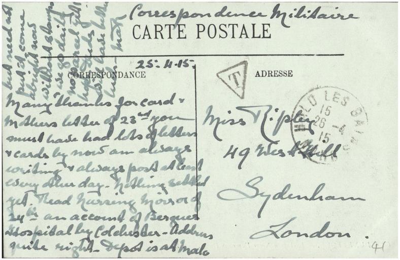 Keywords: postcard dunkirk france ww1 world war 1 worldwar1 public domain publicdomain nurse ripley nurseripley writing text document sketch drawing cartoon Sent by a nurse, Margaret Ripley, to her sister back in England. As far as I can tell (corrections and additions welcome) this reads: "25.11.15 Many thanks for card & mothers letter of 23rd. You must have had lots of letters & cards by now am always writing & always post at least every other day. Nothing settled yet. Read Nursing Mirror of 24th an account of Bergues Hospital by Colchester. Address quite right. Depot is at Malo but need not put it come alright now without stamps & we go daily no parcel yet! Hope Duds will have better luck. Mar" For more details of the story behind this album see www.flickr.com/photos/whatsthatpicture/sets/7215762769463... Sent by a nurse, Margaret Ripley, to her sister back in England. As far as I can tell (corrections and additions welcome) this reads: "25.11.15 Many thanks for card & mothers letter of 23rd. You must have had lots of letters & cards by now am always writing & always post at least every other day. Nothing settled yet. Read Nursing Mirror of 24th an account of Bergues Hospital by Colchester. Address quite right. Depot is at Malo but need not put it come alright now without stamps & we go daily no parcel yet! Hope Duds will have better luck. Mar" For more details of the story behind this album see www.flickr.com/photos/whatsthatpicture/sets/7215762769463... |