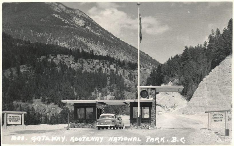 | Keywords: outdoor "1088. Gateway. Kootenay National Park. B.C." Byron Harmon, Banff, Canada. Radium Hot Springs, BC. Located on the Kootenay Highway (Hwy. 93) at the new gateway to Kootenay National Park. The park gateway was relocated in 1954 when increased traffic volume to the park caused the old entranceway to be out-grown. This gate has since been demolished. "1088. Gateway. Kootenay National Park. B.C." Byron Harmon, Banff, Canada. Radium Hot Springs, BC. Located on the Kootenay Highway (Hwy. 93) at the new gateway to Kootenay National Park. The park gateway was relocated in 1954 when increased traffic volume to the park caused the old entranceway to be out-grown. This gate has since been demolished. |