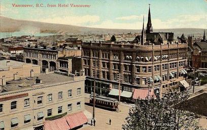 | Keywords: outdoor architecture skyline building city "Vancouver, B.C., from Hotel Vancouver" Souvenir Post Card. The Valentine & Sons' Publishing Co., Ltd. Montreal and Toronto. Printed in Great Britain. Photograph by Philip Timms. Prominent on the NE corner of Granville and Georgia Streets in Vancouver, BC is the Hudson's Bay department store (opened September 21, 1893; demolished March 27, 1926). The property to the east at Georgia and Seymour Streets (far right) will become the first phase of expansion (built 1911-13, extant). After the demolition of the 1893 structure, the second phase of expansion will be completed to match the first (extant). A third expansion phase continued the store north down Granville Street (1926) and a fourth phase expanded the store north down Seymour Street (1949-50). The building on the NW corner (bottom left) was the Johnston-Howe Block, completed in 1901. Demolished 1972 to make way for the IBM Building (built 1973-75). "Vancouver, B.C., from Hotel Vancouver" Souvenir Post Card. The Valentine & Sons' Publishing Co., Ltd. Montreal and Toronto. Printed in Great Britain. Photograph by Philip Timms. Prominent on the NE corner of Granville and Georgia Streets in Vancouver, BC is the Hudson's Bay department store (opened September 21, 1893; demolished March 27, 1926). The property to the east at Georgia and Seymour Streets (far right) will become the first phase of expansion (built 1911-13, extant). After the demolition of the 1893 structure, the second phase of expansion will be completed to match the first (extant). A third expansion phase continued the store north down Granville Street (1926) and a fourth phase expanded the store north down Seymour Street (1949-50). The building on the NW corner (bottom left) was the Johnston-Howe Block, completed in 1901. Demolished 1972 to make way for the IBM Building (built 1973-75). |