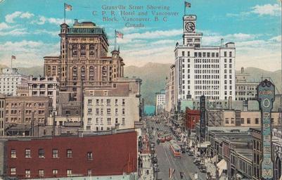 | Keywords: building architecture outdoor skyline city "Granville Street Showing C. P. R. Hotel and Vancouver Block, Vancouver, B. C. Canada" Post Card. Published by The Coast Publishing Co., Vancouver, B. C. Made in U.S.A. View looking north up Granville Street from about the 800-block (Smithe St.) in Vancouver, BC. "Granville Street Showing C. P. R. Hotel and Vancouver Block, Vancouver, B. C. Canada" Post Card. Published by The Coast Publishing Co., Vancouver, B. C. Made in U.S.A. View looking north up Granville Street from about the 800-block (Smithe St.) in Vancouver, BC. |