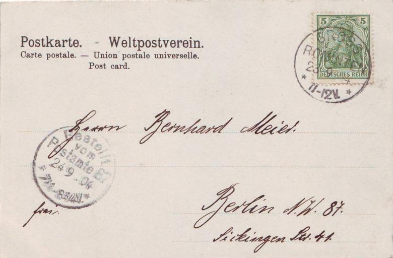 | Keywords: Postcard Gross-Rominten - Berlin 1904.jpg en Address side of a picture postcard from Gross-Rominten then in Germany now Krasnolesye in Russia to Berlin 23 September 1904 ˜Bestellstempel ™ Berlin 24 September 1904 1904-09-23 postcard franking ; 2012-04-16 scan own scan Stamp designer Creator Paul Eduard Waldraff Postcard unknown Sijtze Reurich Stamp 1917 Postcard PD-text Postcards of Germany 1902 stamps of the German Empire Uploaded with UploadWizard Krasnolesye Stamps on covers and postcards Postmarks of Russia |
