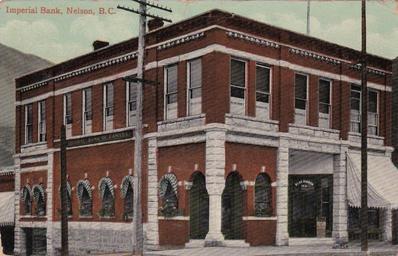 | Keywords: building architecture outdoor "Imperial Bank, Nelson, B.C." Souvenir Post Card. The Valentine & Sons' Publishing Co., Ltd. Montreal and Toronto. Printed in Great Britain. Houston Block, 601-607 Baker Street (NE corner at Josephine Street), Nelson, BC. Built 1899; Extant. Commissioned by John Houston. Architect: A.E. Hodgins. Imperial Bank of Canada, J. M. Lay, Manager, Houston Block, Baker corner Josephine, Nelson, BC Phone 108. [1910] "Imperial Bank, Nelson, B.C." Souvenir Post Card. The Valentine & Sons' Publishing Co., Ltd. Montreal and Toronto. Printed in Great Britain. Houston Block, 601-607 Baker Street (NE corner at Josephine Street), Nelson, BC. Built 1899; Extant. Commissioned by John Houston. Architect: A.E. Hodgins. Imperial Bank of Canada, J. M. Lay, Manager, Houston Block, Baker corner Josephine, Nelson, BC Phone 108. [1910] |