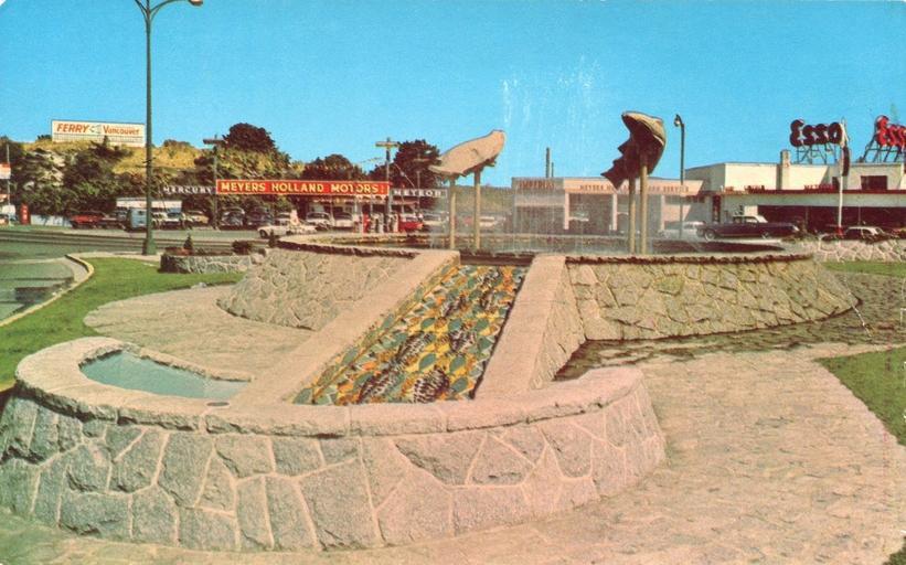 | Keywords: outdoor "Italian Fountain — The colourful Italian Fountain was presented in 1958 by Nanaimo citizens of Italian origin to the City of Nanaimo commemorating British Columbia's 100th anniversary. The fountain depicts the life of the salmon." Color Photo by W.J.L. Gibbons, AMPA. Published and distributed by Stan V. Wright & Co. Victoria, B.C. Extant at Italian Square Park, Nanaimo, BC on Vancouver Island. "Italian Fountain — The colourful Italian Fountain was presented in 1958 by Nanaimo citizens of Italian origin to the City of Nanaimo commemorating British Columbia's 100th anniversary. The fountain depicts the life of the salmon." Color Photo by W.J.L. Gibbons, AMPA. Published and distributed by Stan V. Wright & Co. Victoria, B.C. Extant at Italian Square Park, Nanaimo, BC on Vancouver Island. |