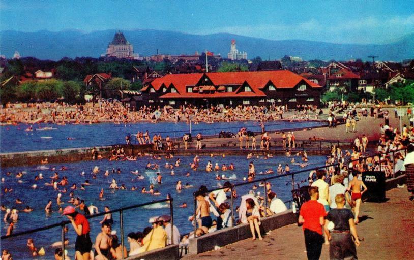 | Keywords: outdoor landscape seaside shore "V-34 KITSILANO BEACH, Vancouver, B.C. (Canada) Located 5 minutes drive from the heart of the city is Kitsilano Beach — another of the many lovely beaches skirting the city. Adjoining is one of the largest outdoor swimming pools on this continent, containing 220 yards of racing lanes, grandstand, high diving boards, etc. The red-roofed bathhouse provides ample facilities for the thousands of bathers. The Kitsilano Beach was named after the Chief of the Squamish Indians." Color Photo—Courtesy of C.P.R. Pub. by Vancouver Magazine Serv. Ltd., Vancouver, B. C. Printed in U.S.A. "V-34 KITSILANO BEACH, Vancouver, B.C. (Canada) Located 5 minutes drive from the heart of the city is Kitsilano Beach — another of the many lovely beaches skirting the city. Adjoining is one of the largest outdoor swimming pools on this continent, containing 220 yards of racing lanes, grandstand, high diving boards, etc. The red-roofed bathhouse provides ample facilities for the thousands of bathers. The Kitsilano Beach was named after the Chief of the Squamish Indians." Color Photo—Courtesy of C.P.R. Pub. by Vancouver Magazine Serv. Ltd., Vancouver, B. C. Printed in U.S.A. |