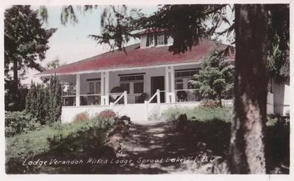| Keywords: outdoor architecture building "Lodge Verandah, Klitsa Lodge, Sproat Lake, V.I., B.C." Postcard. Made in Canada by The Gowen, Sutton Co. Ltd., Vancouver, B. C. Klitsa Lodge, Sproat Lake Road R.R. 3, Sproat Lake (Alberni), BC on Vancouver Island. Hotel and boats for hire. Originally Kleetsie Lodge. First listed in 1928. Mrs. J.E. Wark, proprietor (1928-42). Mrs. R. Bryant (1944). Sproat Lake Resorts Ltd., operators. Mr. and Mrs. A.R. Cole, managers (1945- ). "KLITSA LODGE Situated on Beautiful Sproat Lake 10 Miles from Alberni. Hunting — Hiking — Fishing — Bathing — Saddle Horses Inboard and Outboard Motors — Speed Boat — Canoes — Fishing Tackle American Plan $5.50 Per Day Room with Connecting Bath. Operated by Sproat Lake Resorts Ltd. Phone Port Alberni 44-X for reservations." (1945) "Lodge Verandah, Klitsa Lodge, Sproat Lake, V.I., B.C." Postcard. Made in Canada by The Gowen, Sutton Co. Ltd., Vancouver, B. C. Klitsa Lodge, Sproat Lake Road R.R. 3, Sproat Lake (Alberni), BC on Vancouver Island. Hotel and boats for hire. Originally Kleetsie Lodge. First listed in 1928. Mrs. J.E. Wark, proprietor (1928-42). Mrs. R. Bryant (1944). Sproat Lake Resorts Ltd., operators. Mr. and Mrs. A.R. Cole, managers (1945- ). "KLITSA LODGE Situated on Beautiful Sproat Lake 10 Miles from Alberni. Hunting — Hiking — Fishing — Bathing — Saddle Horses Inboard and Outboard Motors — Speed Boat — Canoes — Fishing Tackle American Plan $5.50 Per Day Room with Connecting Bath. Operated by Sproat Lake Resorts Ltd. Phone Port Alberni 44-X for reservations." (1945) |