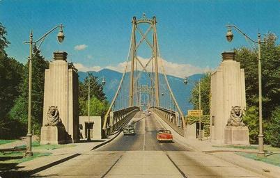 | Keywords: photo border outdoor drawing "VANCOUVER, B. C., CANADA Stanley Park Entrance to the Lions Gate Bridge" Copyright Kodachrome Card. Litho'd in Van., B.C. Canada. Color Photograph and Published by The Coast Publishing Co., Vancouver, Canada. Opened in 1938 as a two-lane toll crossing. Built in 1937-38 for the Guinness Family to connect the North Vancouver and West Vancouver districts and property investments to downtown Vancouver for the purposes of developing the British Properties. In 1952, the bridge was purchased by the Provincial government and converted to three-lanes. Tolls continued until 1963. "VANCOUVER, B. C., CANADA Stanley Park Entrance to the Lions Gate Bridge" Copyright Kodachrome Card. Litho'd in Van., B.C. Canada. Color Photograph and Published by The Coast Publishing Co., Vancouver, Canada. Opened in 1938 as a two-lane toll crossing. Built in 1937-38 for the Guinness Family to connect the North Vancouver and West Vancouver districts and property investments to downtown Vancouver for the purposes of developing the British Properties. In 1952, the bridge was purchased by the Provincial government and converted to three-lanes. Tolls continued until 1963. |