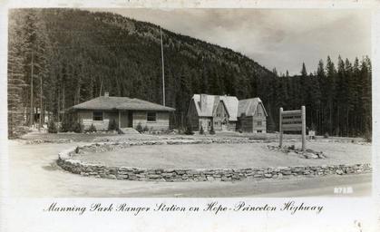 | Keywords: outdoor blackandwhite black and white "Manning Park Ranger Station on Hope-Princeton Highway" Located at E.C. Manning Provincial Park (established 1941), on Hope-Princeton Highway section of BC Hwy. 3, the Southern Trans-Provincial Highway (a.k.a. Crowsnest Highway). Photograph circa-late-1950s. The Hope-Princeton Highway opened on November 2, 1949. "Manning Park Ranger Station on Hope-Princeton Highway" Located at E.C. Manning Provincial Park (established 1941), on Hope-Princeton Highway section of BC Hwy. 3, the Southern Trans-Provincial Highway (a.k.a. Crowsnest Highway). Photograph circa-late-1950s. The Hope-Princeton Highway opened on November 2, 1949. |