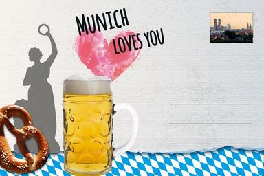 Keywords: postcard munich breze pretzel salty sodium hydroxide solution dipped pastry characteristic looped form beer argyle pattern cosmopolitan city bavaria landmark heart watercolor stamp