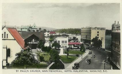 | Keywords: photo border "St. Paul's Church, War Memorial, Hotel Malaspina, Nanaimo, B.C." Postcard. Made in Canada by The Gowen, Sutton Co. Ltd., Vancouver, B. C. View looking NE up the 000-block of Church Street towards the intersection at Front Street in Nanaimo, BC on Vancouver Island. "St. Paul's Church, War Memorial, Hotel Malaspina, Nanaimo, B.C." Postcard. Made in Canada by The Gowen, Sutton Co. Ltd., Vancouver, B. C. View looking NE up the 000-block of Church Street towards the intersection at Front Street in Nanaimo, BC on Vancouver Island. |