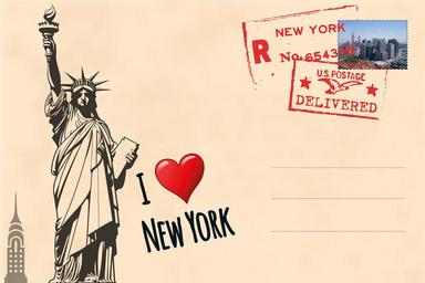 Keywords: postcard new york statue of liberty chrysler building vintage old antique cosmopolitan city landmark stamp new skyline lettering graphic