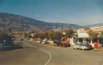 | Keywords: outdoor road "The Business Section in Osoyoos, B.C." Made in Canada by Grant-Mann Lithographers Ltd. "Color Card" Division, Vancouver, British Columbia. Westward view up Main Street (Hwy. 3, the Southern Trans-Provincial Highway, later the Crowsnest Highway) from the curve at Spartan Drive in Osoyoos, BC. "The Business Section in Osoyoos, B.C." Made in Canada by Grant-Mann Lithographers Ltd. "Color Card" Division, Vancouver, British Columbia. Westward view up Main Street (Hwy. 3, the Southern Trans-Provincial Highway, later the Crowsnest Highway) from the curve at Spartan Drive in Osoyoos, BC. |