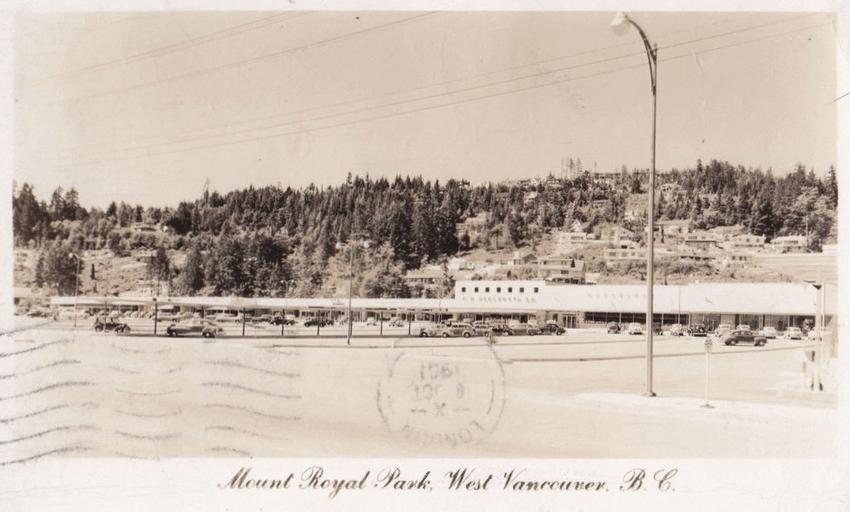 | Keywords: outdoor snow monochrome "Mount Royal Park [sic], West Vancouver, B. C." Post Card. Made in Canada by J.C. Walker, Vancouver, B.C. Park Royal Shopping Centre, West Vancouver, BC. Canada's first shopping mall. Opened in September 1950 with Woodward's department store as its main anchor tenant. "Mount Royal Park [sic], West Vancouver, B. C." Post Card. Made in Canada by J.C. Walker, Vancouver, B.C. Park Royal Shopping Centre, West Vancouver, BC. Canada's first shopping mall. Opened in September 1950 with Woodward's department store as its main anchor tenant. |