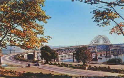 | Keywords: outdoor "PATTULLO BRIDGE Spans the Fraser River at New Westminster, B. C. It is the chief highway link between the lush Fraser Valley and the Pacific Coast." Pub. by Vancouver Magazine Serv. Ltd., Vancouver, B. C. Printed in U.S.A. The Pattullo Bridge, New Westminster, BC. Constructed 1936-37; extant. Northeast view across the Fraser River toward Surrey from above Columbia Street in New Westminster. Visible upstream to the north is the old Fraser River Bridge (low level road-rail with swing span, 1904; extant without road portion). This crossing was part of the Pacific Highway route to the U.S. Border (Hwy. 99, 1941-62; later 99A) and the old Trans-Canada Highway (Hwy. 1, c.1950-64; later 1A). "PATTULLO BRIDGE Spans the Fraser River at New Westminster, B. C. It is the chief highway link between the lush Fraser Valley and the Pacific Coast." Pub. by Vancouver Magazine Serv. Ltd., Vancouver, B. C. Printed in U.S.A. The Pattullo Bridge, New Westminster, BC. Constructed 1936-37; extant. Northeast view across the Fraser River toward Surrey from above Columbia Street in New Westminster. Visible upstream to the north is the old Fraser River Bridge (low level road-rail with swing span, 1904; extant without road portion). This crossing was part of the Pacific Highway route to the U.S. Border (Hwy. 99, 1941-62; later 99A) and the old Trans-Canada Highway (Hwy. 1, c.1950-64; later 1A). |