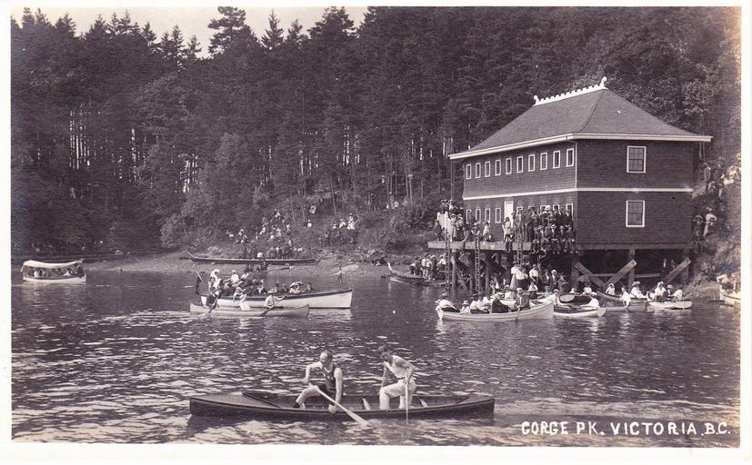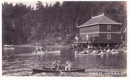 | Keywords: outdoor "Gorge Pk. Victoria, B.C." AZO Post Card. Public Bathing Pavillion on the north shore of the Gorge Waterway, east of the Gorge Bridge and rapids, at Gorge Park (Saanich). Built 1911. Destroyed by fire on July 19, 1945. The building was commonly called the "Free" because it charged no admission. This was in contrast to the Gorge Swimming Baths (opened 1906) located on the south shore behind Elizabeth Marshall's hotel and tavern ('Gorge Pointe', Esquimalt), a 43-stall change facility that charged 10¢. It became known as the "Pay". "Gorge Pk. Victoria, B.C." AZO Post Card. Public Bathing Pavillion on the north shore of the Gorge Waterway, east of the Gorge Bridge and rapids, at Gorge Park (Saanich). Built 1911. Destroyed by fire on July 19, 1945. The building was commonly called the "Free" because it charged no admission. This was in contrast to the Gorge Swimming Baths (opened 1906) located on the south shore behind Elizabeth Marshall's hotel and tavern ('Gorge Pointe', Esquimalt), a 43-stall change facility that charged 10¢. It became known as the "Pay". |