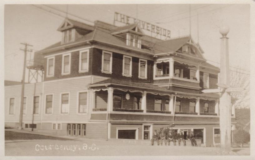 | Keywords: building architecture monochrome "Courtenay, B.C." Postcard. Made in Canada by The Gowen, Sutton Co. Ltd., Vancouver, B. C. The Riverside, 191 5th (Union) Street, Courtenay, BC on Vancouver Island. "RIVERSIDE HOTEL R. B. Dixon, Proprietor On The Island Highway Auto Headquarters — Telephone 9 and 49 Forty First-class Rooms — Cafe in Connection Hot and Cold water in Every Room — Heated Throughout Courtenay, Vancouver Island" [1925] Inscription: "Nov. 1, 1928. This is the main and largest hotel, situated about the center and the view of the street must have been taken from the Dummy Policeman on the cross-roads. The Riverside Hotel. Doc Aitken stays here. The Royal Bank of Canada is across the St. on the left and facing the hotel is the Canadian Bank of Commerce they are not shown here. The main St. is Union, to the left Union Bay Rd. to the right Isabel St." "Courtenay, B.C." Postcard. Made in Canada by The Gowen, Sutton Co. Ltd., Vancouver, B. C. The Riverside, 191 5th (Union) Street, Courtenay, BC on Vancouver Island. "RIVERSIDE HOTEL R. B. Dixon, Proprietor On The Island Highway Auto Headquarters — Telephone 9 and 49 Forty First-class Rooms — Cafe in Connection Hot and Cold water in Every Room — Heated Throughout Courtenay, Vancouver Island" [1925] Inscription: "Nov. 1, 1928. This is the main and largest hotel, situated about the center and the view of the street must have been taken from the Dummy Policeman on the cross-roads. The Riverside Hotel. Doc Aitken stays here. The Royal Bank of Canada is across the St. on the left and facing the hotel is the Canadian Bank of Commerce they are not shown here. The main St. is Union, to the left Union Bay Rd. to the right Isabel St." |