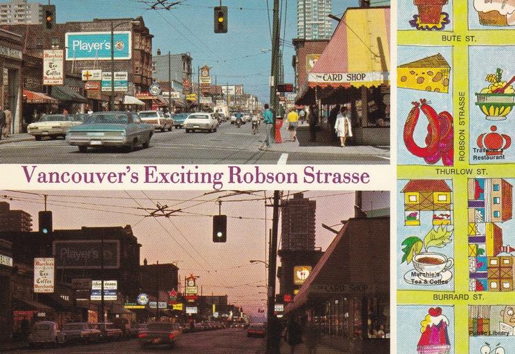 Keywords: outdoor shop "Vancouver's Exciting Robson Strasse" "G-115 ROBSON STRASSE Vancouver, B.C., Canada This exciting street with its varied specialty shops is as continental as Europe itself. A tribute to the foresight of many new Canadians, this business district enjoys prosperous times. The day and night views illustrate this colorful street. Photos by John N. T. Smith" Grande Post Card. LS-4198. A Traveltime Product. Published by Natural Color Productions Ltd., Burnaby 2, B.C. Made in Canada. View looking west into the 1000-block of Robson Street from the intersection at Burrard Street in Vancouver, BC. "Vancouver's Exciting Robson Strasse" "G-115 ROBSON STRASSE Vancouver, B.C., Canada This exciting street with its varied specialty shops is as continental as Europe itself. A tribute to the foresight of many new Canadians, this business district enjoys prosperous times. The day and night views illustrate this colorful street. Photos by John N. T. Smith" Grande Post Card. LS-4198. A Traveltime Product. Published by Natural Color Productions Ltd., Burnaby 2, B.C. Made in Canada. View looking west into the 1000-block of Robson Street from the intersection at Burrard Street in Vancouver, BC. |