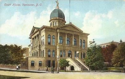 | Keywords: outdoor architecture photo border building "Court House, Vancouver, B. C." Private Postcard. Published by Stedman Bros. Ltd., Brantford, Canada. Made in Germany. The old Vancouver Court House (1888-1912) on the SW corner of West Hastings and Cambie Streets in Vancouver, BC. Now the site of Victory Square (1924). "Court House, Vancouver, B. C." Private Postcard. Published by Stedman Bros. Ltd., Brantford, Canada. Made in Germany. The old Vancouver Court House (1888-1912) on the SW corner of West Hastings and Cambie Streets in Vancouver, BC. Now the site of Victory Square (1924). |