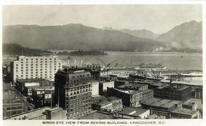 | Keywords: "Birds Eye View from Bekins Building, Vancouver, B.C." Post Card by Gowen. NW view of Vancouver business district and harbour taken from the Sun Tower (built 1911-12; extant). Originally called the World Building, Bekins Moving and Storage Company became its tenant from 1924 to 1937. It then became home of the Vancouver Sun newspaper (1937-65) where it became known as the Sun Tower. "Birds Eye View from Bekins Building, Vancouver, B.C." Post Card by Gowen. NW view of Vancouver business district and harbour taken from the Sun Tower (built 1911-12; extant). Originally called the World Building, Bekins Moving and Storage Company became its tenant from 1924 to 1937. It then became home of the Vancouver Sun newspaper (1937-65) where it became known as the Sun Tower. |