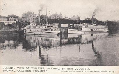 | Keywords: outdoor "General View of Wharves, Nanaimo, British Columbia, Showing Coasting Steamers. Published by T. N. Hibben & Co., Victoria, British Columbia. No. 107." Post Card. Wharves at Nanaimo, BC on Vancouver Island. Visible are the coastal steamers S.S. Joan and S.S. City of Nanaimo. "General View of Wharves, Nanaimo, British Columbia, Showing Coasting Steamers. Published by T. N. Hibben & Co., Victoria, British Columbia. No. 107." Post Card. Wharves at Nanaimo, BC on Vancouver Island. Visible are the coastal steamers S.S. Joan and S.S. City of Nanaimo. |