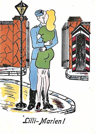 | Keywords: Postkartenmotiv Paris1942 Lilli-Marleen B001.png en German Wehrmacht in France 1942 - Propaganda postcard of the army postal service from Paris 1942 with Lili Marleen motive in allusion on the famous soldier's song Lili Marleen from Lale Andersen from 1939 de Deutsche Wehrmacht in Frankreich 1942 - Propaganda-Postkarte der Deutschen Feldpost Paris 1942 mit Lili-Marleen-Motiv in Anspielung auf das berühmte Soldatenlied Lili Marleen von Lale Andersen aus dem Jahre 1939 scan of original Gefreiter Schaller drawing ;<br /> Gefreiter Beier print ;<br />Deutsche Wehrmacht - Militärbefehlshaber Frankreich - Platzkommandantur des Kommandanten von Paris Paris 1942 Publisher 1942 PD-GermanGov PD-old-70 1942 drawings 1942 in Paris German occupation in Paris Old military postcards of Germany Art styles approved by Nazi regime Postcards of people in France 1942 postcards |