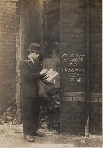 | Keywords: postman post address chalk mail mailman delivery uniform sack brickwall 1922 1920s fire monochrome Photograph of the aftermath of the Great Timber Yard Fire in Hartlepool, 1922. Shows the postman attempting to deliver letters to the ruined houses. Forwarding addresses have been chalked on the walls in cases where victims have gone to stay with kindly neighbours, relatives or friends, their homes having been destroyed. Photograph Collection No : 366 Images from Hartlepool Cultural Services that are part of The Commons on Flickr are labeled 'no known copyright restrictions' indicating that Hartlepool Cultural Services is unaware of any current copyright restrictions on these images either because the copyright is waived or the term of copyright has expired. Commercial use of images is not permitted. Applications for commercial use or for higher quality reproductions should be made to Hartlepool Cultural Services, Sir William Gray House, Clarence Road, Hartlepool, TS24 8BT. When using the images please credit 'Hartlepool Cultural Services'. Photograph of the aftermath of the Great Timber Yard Fire in Hartlepool, 1922. Shows the postman attempting to deliver letters to the ruined houses. Forwarding addresses have been chalked on the walls in cases where victims have gone to stay with kindly neighbours, relatives or friends, their homes having been destroyed. Photograph Collection No : 366 Images from Hartlepool Cultural Services that are part of The Commons on Flickr are labeled 'no known copyright restrictions' indicating that Hartlepool Cultural Services is unaware of any current copyright restrictions on these images either because the copyright is waived or the term of copyright has expired. Commercial use of images is not permitted. Applications for commercial use or for higher quality reproductions should be made to Hartlepool Cultural Services, Sir William Gray House, Clarence Road, Hartlepool, TS24 8BT. When using the images please credit 'Hartlepool Cultural Services'. |