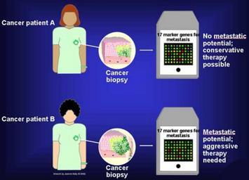 | Keywords: Potential Markers for Metastasis.jpg en Text from Cancer gov Gene expression patterns are also being used as a tool for improving the diagnosis of breast cancer Microarrays have been used to examine the expression patterns of some 25 000 genes in tissues from breast cancer patients Computer cluster analysis of the patterns led to the identification of about 17 marker genes that can correctly identify about 90 percent of the women who would eventually develop metastases While still experimental such studies bring hope that clinicians will be able to act much sooner and use new technology to better monitor the women more likely to experience aggressive progression of their breast cancer 2014-01-28 21 29 25 http //www cancer gov/cancertopics/understandingcancer/moleculardiagnostics/AllPages National Cancer Institute PD-USGov Molecular biology Medicine Uploaded with UploadWizard |