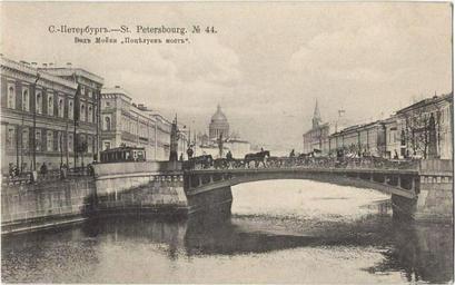 | Keywords: PotseluevBridgePostcard1914.jpg 1914 postcard with a view of Potseluev Bridge across the Moika River in Saint Petersburg Отк ытка с видом Поцелуева моста че ез еку ойку в Санкт-Пете бу ге http //www sheleg ru/foto1/main php g2_view core DownloadItem g2_itemId 125 g2_serialNumber 1 1914 Конт агентство А В Суво ина и Ко PD-old Potseluev Bridge Postcards of bridges in Saint Petersburg Trams in Saint Petersburg Moika River from Postoffice Bridge to Krasnoflotskii bridge | ||||