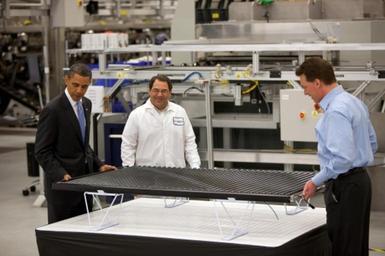 Keywords: Potus solyndra.jpg en President Barack Obama examines a solar panel with Solyndra CEO Chris Gronet right and Executive Vice President Ben Bierman during a tour of Solyndra http //www whitehouse gov/blog/2010/05/26/we-ve-got-go-back-making-things Lawrence Jackson 2010-05-26 PD-USGov Solyndra Concentrated photovoltaics Solar cell panels