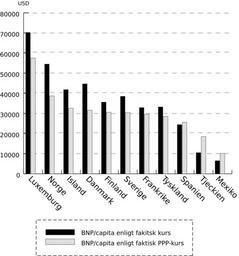 | Keywords: Pppgdp vers gdp in oecd swedish.svg Statistik från OECD år 2004 Dessa länders BNP per capita mätt i amerikanska dollar skiljer sig beroende på hur man omvandlar valutorna från inhemsk valuta till dollar Varje land visas här med både köpkraftsjusterad PPP BNP/capita och BNP/capita efter valutamarknadesn växlingskurser från år 2004 Från data publicerade av OECD www oecd org statistics national accounts på http //dx doi org/10 1787/546114387831 Own 1 Jan 2005 Josef Lilljegren Josef lilljegren Check categories 2009 February 8 sv wikipedia Köpkraftsparitet 1 International economics |