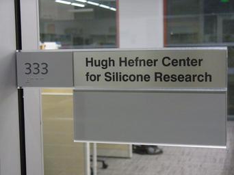 | Keywords: PrankSign3.jpg en Prank sign<br> Hugh Hefner Center for Silicone Research <br>which has been installed as a yoke by students at Stanford University Stanford University often names rooms or entire buildings after generous donors <br> However Hugh Hefner the founder of Playboy magazine is none of them <br> Also notice that the sign mentions Silicone which is used for breast implants instead of Silicon which is used for semiconductor research at Stanford University This sign is located at Room 333<br> James Anna Marie Spilker Engineering Applied Sciences Building<br> 348 Via Pueblo Mall<br> Stanford CA 94305<br> U S A 37 4288 degrees north<br> 122 1740 degrees west 2013-01-21 own Silicon Researcher <gallery> File PrankSign1 jpg File PrankSign2 jpg File PrankSign3 jpg </gallery> 37 4288 -122 1740 cc-zero Pranks College life Hugh Hefner Uploaded with UploadWizard Stanford University campus |