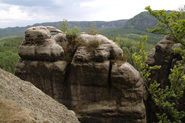 Keywords: pravcicka switzerland brana saxon czech park outdoor hill weathering arch form stone opening natural gate national view rock arc trees landmark symbol sunny sandstone prebischtor tourist massive window tall forest