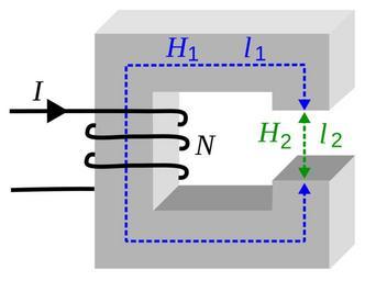 | Keywords: Prawo przeplywu.svg pl Prawo przepływu prawo Ampera N I H<sub>1</sub> l<sub>1</sub> + H<sub>2</sub> l<sub>2</sub> Drawing of an Wikipedia electromagnet with a closed magnetic circuit showing the quantities needed to calculate the magnetic field using Ampere's Law N is the number of turns of the wire winding I is the current in the winding in amperes l<sub>1</sub> is the length of the flux path or magnetic circuit lying within the magnetic core in meters H<sub>1</sub> is the strength of the magnetizing field in the core in ampere-turns l<sub>2</sub> is the length of the air gap and H<sub>2</sub> is the strength of the magnetizing field in the air gap Ampere's Law is <math>N I H_1 l_1 + H_2 l_2</math> own Zureks 2009 Magnetism diagrams |