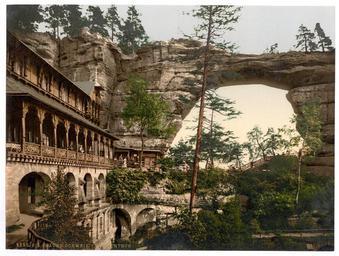 | Keywords: Prebischthor, Saxony, Germany WDL2643.png Artwork ru П авчицкие во ота Саксония Ге мания fr Prebischthor Saxe Allemagne en Prebischthor Saxony Germany zh 石景奇观,萨克森,德国 pt Prebischthor Saxônia Alemanha ar بريبيشتور، ساكسونيا، ألمانيا ru П авчиска Б ана или П ебишто как его называют на немецком языке является к упнейшим в Ев опе мостом из п и одного камня Он асположен в той части сов еменной Чешской Республики кото ая известна как Чешская Швейца ия ши око известном ту истическом айоне асположенном на г анице с сов еменной Ге манией Здание изоб аженное на данном цветном снимке известно под названием Соколиное гнездо Sokolí hnízdo на чешском языке Здание было пост оено в 1881 году семьей Кла и-Алд инген для азмещения именитых гостей Этот егион являлся частью Судетенленда те ито ии в 1938 году отошедшей к Ге мании и возв ащенной Чехословакии после Вто ой ми овой войны <br>П и одные мосты; Скальные об азования; Ту истические места fr Pravčická brána Prebischthor en allemand est le plus grand pont en pierre naturelle d'Europe Il est situé sur une partie de l'actuelle République tchèque connue sous le nom de Suisse tchèque une célèbre région touristique à proximité de la frontière avec l'actuelle Allemagne Le bâtiment montré dans ce cliché photochrome est connu sous le nom de Nid du Faucon Sokoli hnízdo en tchèque Il fut construit en 1881 par la famille Clary-Aldringen pour recevoir des invités de marque Cette région fait partie des Sudètes qui furent cédées à l'Allemagne par la Tchécoslovaquie en 1938 puis restituées à la Tchécoslovaquie après la Seconde Guerre mondiale <br>Ponts naturels; Formations rocheuses; Sites touristiques en Pravčická brána Prebischthor in German is the largest natural stone bridge in Europe It is located in a part of the present-day Czech Republic known as Czech Switzerland a well-known tourist region close to the border with present-day Germany The building shown in this photochrome print is known as the Falcon's Nest Sokolí hnízdo in Czech It was built in 1881 by the Clary-Aldringen family to accommodate important guests This area was part of the Sudetenland which was ceded by Czechoslovakia to Germany in 1938 but restored to Czechoslovakia after World War II <br>Natural bridges; Rock formations; Tourist sites zh Pravčická brána(德语中称之为 Prebischthor)是欧洲 大的天然石桥 该石桥位于今天的捷克共和国境内,该 区被称为 捷克的瑞士 ,是 处著名的旅游区,临近今天的德国边境 该彩色照片中 拍摄的建筑叫 Falcon's Nest (捷克语称之为 Sokolí hnízdo) 该建筑建于1881年,是克拉里-阿尔德林根家族建 用以招待重要客人的 该 区属于苏台德区,1938 年被捷克斯洛伐克割让给了德国,二战后又被重新纳入捷克斯洛伐克 <br>天然桥梁; 岩层; 旅游 pt Pravčická brána Prebischthor em alemão é a maior ponte natural de pedra da Europa Localiza-se em uma região da atual República Tcheca conhecida como Suíça Tcheca uma famosa região turística perto da fronteira com a atual Alemanha O prédio mostrado nesta ilustração fotocrômica é conhecido como o Ninho do Falcão Sokolí hnízdo em tcheco Foi construído em 1881 pela família Clary-Aldringen para acomodar hóspedes importantes Esta área fazia parte da Sudetenland que foi cedida pela Tchecoslováquia à Alemanha em 1938 porém devolvida à Tchecoslováquia após a 2ª Guerra Mundial <br>Pontes naturais; Formações rochosas; Locais turísticos ar يُعتبر براسيسكت برانا أكبر جسر الحجر الطبيعي في أوروبا وهو يقع في جزء ما يُعرف اليوم بالجمهورية التشيكية يُدعى ب سويسرا التشيكية ، وهي عبارة عن منطقة سياحية معروفة في المنطقة القريبة من الحدود مع ألمانيا الحالية يُعرف المبنى المبين في هذه المطبوعة باسم عش الصقر سُوكولي هنزدو باللغة التشيكية شَيَّد العش عائلة كلاري - ألدرينغين عام 1881 لإيواء الضيوف المهمين كانت هذه المنطقة جزءا من سوديتينلاند، التي تخلا عنها تشيكوسلوفاكيا لألمانيا في عام 1938، ولكنها أعيدت إلى تشيكوسلوفاكيا بعد الحرب العالمية الثانية <br>الجسور الطبيعية; التكوينات الصخرية; المواقع السياحية es Pravčická brána Prebischthor en Alemán es el puente de piedra natural más grande de Europa Está situado en una parte de la actual República Checa conocida como la Suiza checa una famosa región turística cercana a la frontera con la actual Alemania El edificio que aparece en está impresión fotocroma se conoce con el nombre de Nido del Halcón Sokolí hnízdo en checo Fue construido en 1881 por la familia Clary-Aldringen para acomodar a los invitados importantes Esta área era parte de la Sudetenland que fue cedida por Checoslovaquia a Alemania en 1938 pero que fue devuelta a Checoslovaquia después de la Segunda Guerra Mundial <br>Puentes naturales; Formaciones rocosas; Lugares de interés turístico 1890 1900 ru Эстампы фотог афии fr Images photographies en Prints Photograp