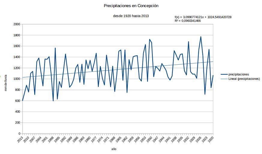 | Keywords: Precipitaciones en Concepción 2013-1920.png es Precipitaciones en Concepción Biobio Chile Se muestra un claro descenso en la intensidad de las precipitaciones como así lo confirma la línea de tendencia con sus respectivas ecuaciones al extremo superior derecho ; así como también las respectivas variaciones de los fenómenos del Niño y la Niña Eje x años Eje y milímetros de lluvia caídos Datos tomados desde los informes meteorológicos anuales de la Dirección Meteorológica de Chile; se toman en cuenta los datos de Carriel Sur desde su inauguración salvo en 1979 con un dato estimado faltaba el mes de diciembre 1964 noviembre 1958 diciembre ; y con los datos de hualpencillo en 1967 1963; de la Universidad de Concepción entre 1961 y 1959; de Punta Hualpén en 1941 http //164 77 222 61/climatologia/php/menuAnuarios php en Rainfall in Concepción Biobio Chile It shows a clear decline in the intensity of rainfall as well as confirms the trend line with their respective equations to top right ; as well as the respective variations of the phenomena of the Child X-axis years y-axis millimeters of rain fallen Data taken from the annual weather reports Meteorological Direction of Chile; Carriel Sur data are taken into account since its inauguration in 1979 saved an estimated data missing the month of December 1964 November 1958 December ; and data Hualpencillo 1967 1963; University of Conception between 1961 and 1959; Punta Hualpén in 1941 de Niederschlagsmenge in Concepción Biobio Chile Es zeigt einen deutlichen Rückgang in der Intensität der Niederschläge sowie bestätigt die Trendlinie mit ihren jeweiligen Gleichungen nach rechts oben ; sowie den jeweiligen Veränderungen der Phänomene des Kindes X-Achse Jahre y-Achse Millimeter regen gefallen Daten aus der jährlichen Wetter genommen berichtet Meteorological Richtung Chile; Carriel Sur Daten berücksichtigt werden seit seiner Eröffnung im Jahr 1979 gerettet geschätzte Daten fehlende Monat Dezember 1964 November 1958 Dezember ; und Daten Hualpencillo 1967 1963; University of Conception zwischen 1961 und 1959; Punta Hualpén 1941 pt Chuvas em Concepción Biobio Chile Ele mostra um claro declínio na intensidade das chuvas bem como confirma a linha de tendência com suas respectivas equações para o topo direito ; bem como as respectivas variações dos fenômenos da Criança X-eixo anos eixo y milímetros de chuva caíram Dados extraídos do tempo relatórios anuais Direção Meteorológica do Chile; Dados Carriel Sur são tidos em conta desde a sua inauguração em 1979 salvo um conjunto de dados estimados faltando o mês de dezembro 1964 novembro de 1958 dezembro ; e dados Hualpencillo 1967 1963; Universidade da Conceição entre 1961 e 1959; Punta Hualpén em 1941 2015-05-07 own Tadeoska other versions cc-zero Uploaded with UploadWizard Climatografía Clima Clima en el Biobio Chile Biobio Precipitaciones Clima en Suramérica |