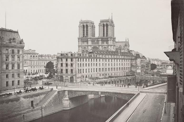 Keywords: Préfecture de police de Paris - Service Photographique, Ancien Hôtel-Dieu.jpg Photograph Creator Hippolyte-Auguste Collard en City Police Préfecture Paris en Hotel Dieu ancien Elevated view across the Seine river towards hospital with towers of Notre Dame Cathedral visible behind line of horse-drawn carriages in left foreground people on bridge depicted people depicted place between 1876 1880 albumen silver 66 5 x 57 cm accession number H87 208/45 SLVIC-digitalimage 273521 H87 208/45 Album with leather covered cardboard covers 148 cardboard leaves holding 69 albumen silver print photographs on one side of leaf only Individual titles and official photographer stamped below image Title embossed on front cover with seal of the City of Paris in gilt ink ; title also on spine Label inside front cover reads Presented to the Public Library c Victoria on the eighth day of April 1881 by the Government of France Hand inscribed note on first page of album upper left Presented April 8th 1881 illegible Photographs various sizes 38 x 27 cm and smaller <br> Album was designed to show the use of photography in the solving of crimes and disasters Gift of the French Government possibly following the International Exhibition of 1880 <br> Official photographer's stamp on each page lower left some images dated 1876 and 1880 One photographer identified Hippolyte-Auguste Collard Institution State Library of Victoria object history exhibition history credit line Gift; Government of France; 1881 Information field Author Préfecture de police de Paris Service Photographique PD-100 Ville de Paris Préfecture de police Images of Paris from the State Library of Victoria Ancien Hôtel-Dieu de Paris Historical images of Petit-Pont Historical photographs of Notre-Dame de Paris West facade of Notre-Dame de Paris before 2000 Notre-Dame de Paris in the 1870s