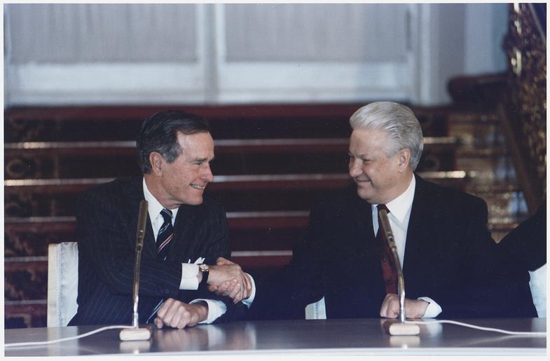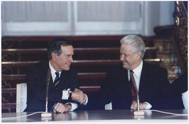 | Keywords: President Bush and Russian President Boris Yeltsin sign the Start II Treaty at a Ceremony in Vladimir Hall, The... - NARA - 186462.tif Scope and content General notes 186462 Local identifier President 1989-1993 Bush Photograph Office 1989 - 1993 NARA-Author Biddle Susan 1940- Photographer 8464488 <br /> George Bush Library NLGB 1000 George Bush Drive West College Station TX 77845 1993-01-03 Record group Collection GB-WHPO Records of the White House Photograph Office 01/20/1989 - 01/20/1993 Record group ARC 1082 George H W Bush Presidential Photographs compiled 01/20/1989 - 01/20/1993 Series ARC 186364 File unit File unit ARC Variant control numbers NAIL Control Number NLB-WHPC-A-P38839 24 yes Other versions NARA-cooperation PD-USGov George H W Bush in 1993 George H W Bush shaking hands Presidents of Russia signing documents Presidents of the United States signing documents Boris Yeltsin 1993 events in Moscow |