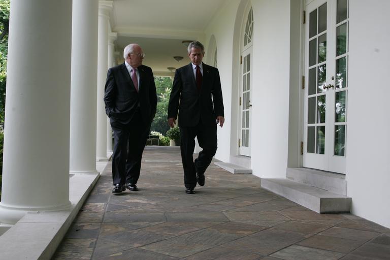 View Original:President_Bush_and_Vice_President_Cheney_Walk_Through_the_White_House_Colonnade.jpg (3504x2336)