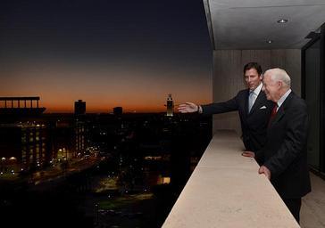 | Keywords: President Carter at the LBJ Library.jpeg 30 284724 -97 727648 en LBJ Library Director Mark K Updegrove shares the beautiful view of the University of Texas and the Austin skyline with President Jimmy Carter on the balcony of the LBJ Library 2011-02-15 http //farm6 staticflickr com/5176/5456561709_5bdd3c2092_o jpg David Valdez PD-USGov Uploaded with UploadWizard President Jimmy Carter Mark Updegrove Presidents of the United States | ||||