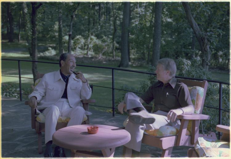 | Keywords: President of Egypt Anwar Sadat and Jimmy Carter meet at the beginning of the Camp David Summit. - NARA - 181074.tif  Scope and content General notes 181074 Local identifier President 1977-1981 Carter White House Staff Photographers 01/20/1977 - 01/20/1981 Jimmy Carter Library NLJC 441 Freedom Parkway Atlanta GA 30307-1498 1978-09-06 Record group Collection JC-WHSP Carter White House Photographs Collection 01/20/1977 - 01/22/1981 Record group ARC 1120 Carter White House Photographs Presidential compiled 01/20/1977 - 01/22/1981 Series ARC 173341 File unit Camp David Summit mtg -- President Carter with President Sadat on the patio 09/06/1978 - 09/06/1978 File unit ARC 181072 Variant control numbers NAIL Control Number NLC-WHSP-C-07269-8 yes Other versions NARA-cooperation PD-USGov Jimmy Carter and Anwar Sadat Camp David Accords |
